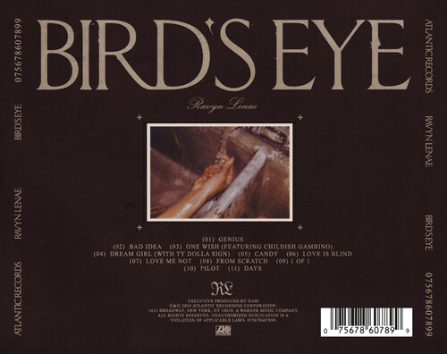 "Love is Blind" reminisces about a past relationship with regret but also hope for personal growth. While "Love Me Not" portrays a tumultuous relationship of desiring someone and rejecting the notion of dependence.'Bird's Eye' signifies returning to a place of self-trust and unbending intuition while acknowledging the paths and turns I've taken to get here," Lenae says of the album. "Revisiting the most basic parts of my identity has allowed me to fully embrace them and be proud of where I'm going." Bird's Eye is the follow-up to Ravyn Lenae's critically acclaimed debut album HYPNOS, which was celebrated by Pitchfork and NPR as one of the best albums of 2022.
