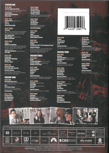 4 MIND-BLOWING SEASONS. Develop a mind for murder with this special collection of Seasons One to Four of the chilling series Criminal Minds. While other investigators focus strictly on the physical evidence, the FBI's Behavioral Analysis Unit (BAU) anticipates the perpetrators' next move by uncovering how they think. Descend into the dark corners of the most dangerous intellects with the uniquely brilliant team led by Unit Chief Aaron Hotchner (Thomas Gibson) and Senior Agents Jason Gideon (Mandy Patinkin) and David Rossi (Joe Mantegna). With quirky genius Dr. Spencer Reid (Matthew Gray Gubler), obsessive behavior specialists Derek Morgan (Shemar Moore), interagency liaison Jennifer "JJ" Jareau (A.J. Cook), sexual offense profiling expert Elle Greenaway (Lola Glaudini), determined newcomer Emily Prentiss (Paget Brewster), and technical analyst Penelope Garcia (Kirsten Vangsness), no crime is unthinkable. Join the chase in the 91 episodes collected in this 24-disc set.