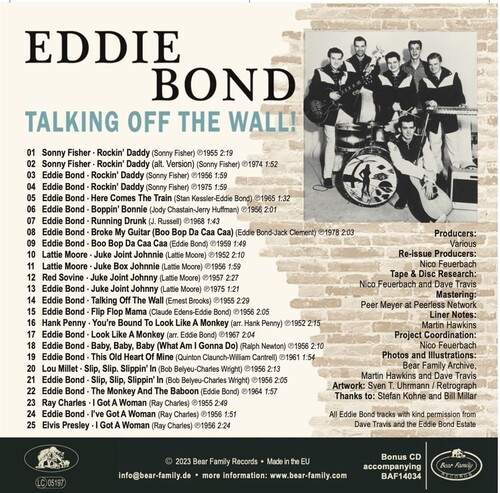 A rocking 14-track LP on Bear Family Records® from one of the original Memphis rockabillies, Eddie Bond, backed up by a 25-track CD featuring original and cover versions of some of Eddie's songs. -Mostly from the mid-1950s, these tracks sparkle with the life and excitement of the new rocking music. -Eddie started and finished as a country singer, but he embraced the new rockabilly music and he soon became the Rockin' Daddy described in his best-selling disc from 1956. -Eddie's backing bands include two of the best guitarists of all time - Reggie Young and Hank Garland - and they don't disappoint. -The ten-inch LP contains one song from Eddie's first label, Ekko, six from his rockabilly heyday on Mercury, two from his originally unissued sessions at Sun in 1958, and five tracks from local Memphis labels in the 1960s. -The bonus CD contains also a further 11 tracks by other artists, providing fascinating other versions of songs Eddie recorded. Artists include Sonny Fisher, Lattie Moore, Ray Charles, and Elvis Presley. Back when Eddie Bond recorded Talkin' Off The Wall for his first ever disc in 1955, he was indeed caught up in a musical moment that was 'off the wall' - in other words seen as highly unusual, strange, eccentric, bizarre. It was the time of the emergence of rockabilly and white rock and roll. Briefly, the 'rockin daddy from ding dong Tennessee' was hot stuff, playing shows with Presley, Perkins, Cash and all the other singers from Memphis whose music talked off the wall to a whole new generation. Today, it does so again. The CD version of 'Talking Off The Wall!' contains all the 14 LP tracks plus another 11 recordings illustrating other ways of playing some of the songs Eddie recorded. Two of the alternative tracks are by Eddie himself; a 1975 later version of his signature Mercury recording from 1956, Rockin' Daddy, and another take on Boo Bop Da Caa Caa, released on his Stompertime label in 1959 within a year of his rejected Sun version.